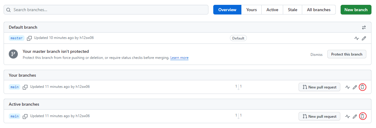 기본값이 아닌 브런치들만 제거 할수 있는데 우측에 휴지통 모양 클릭하면