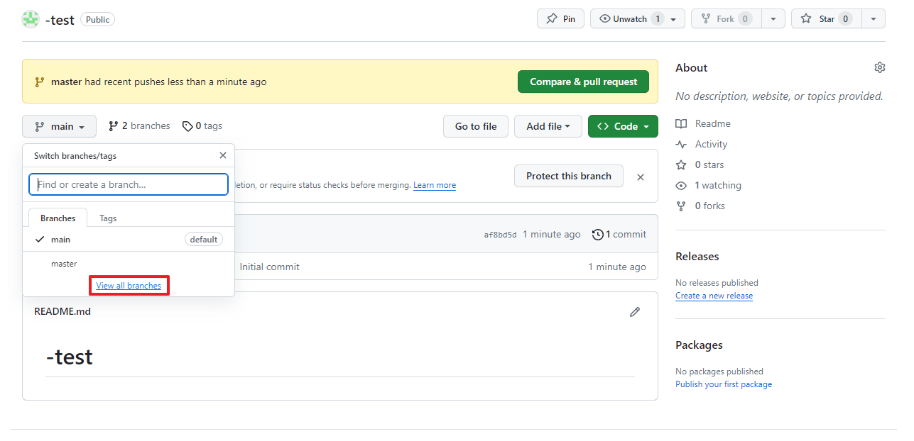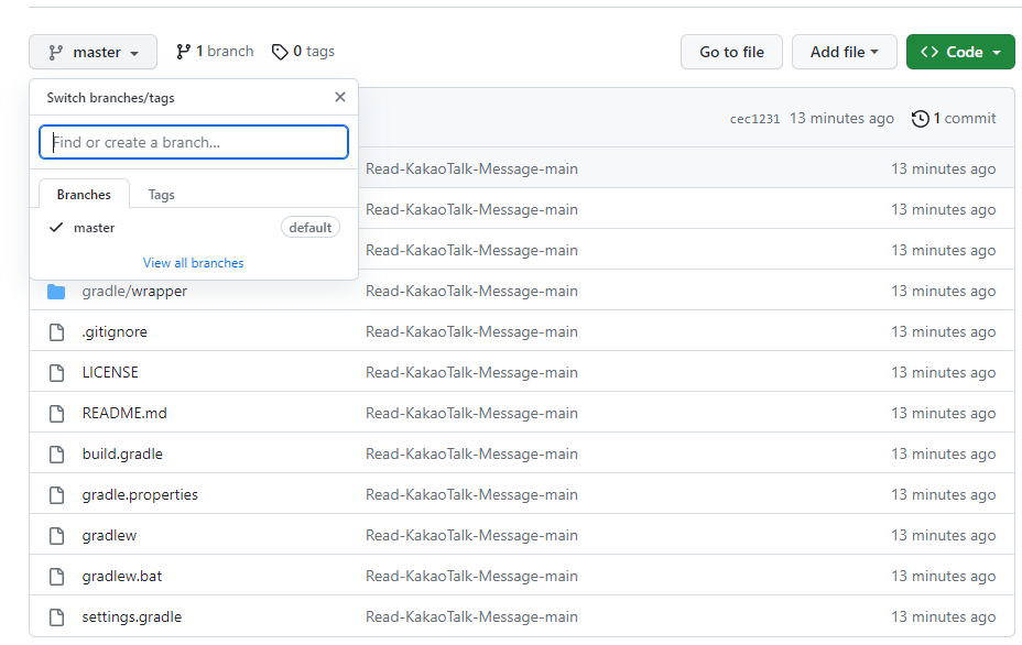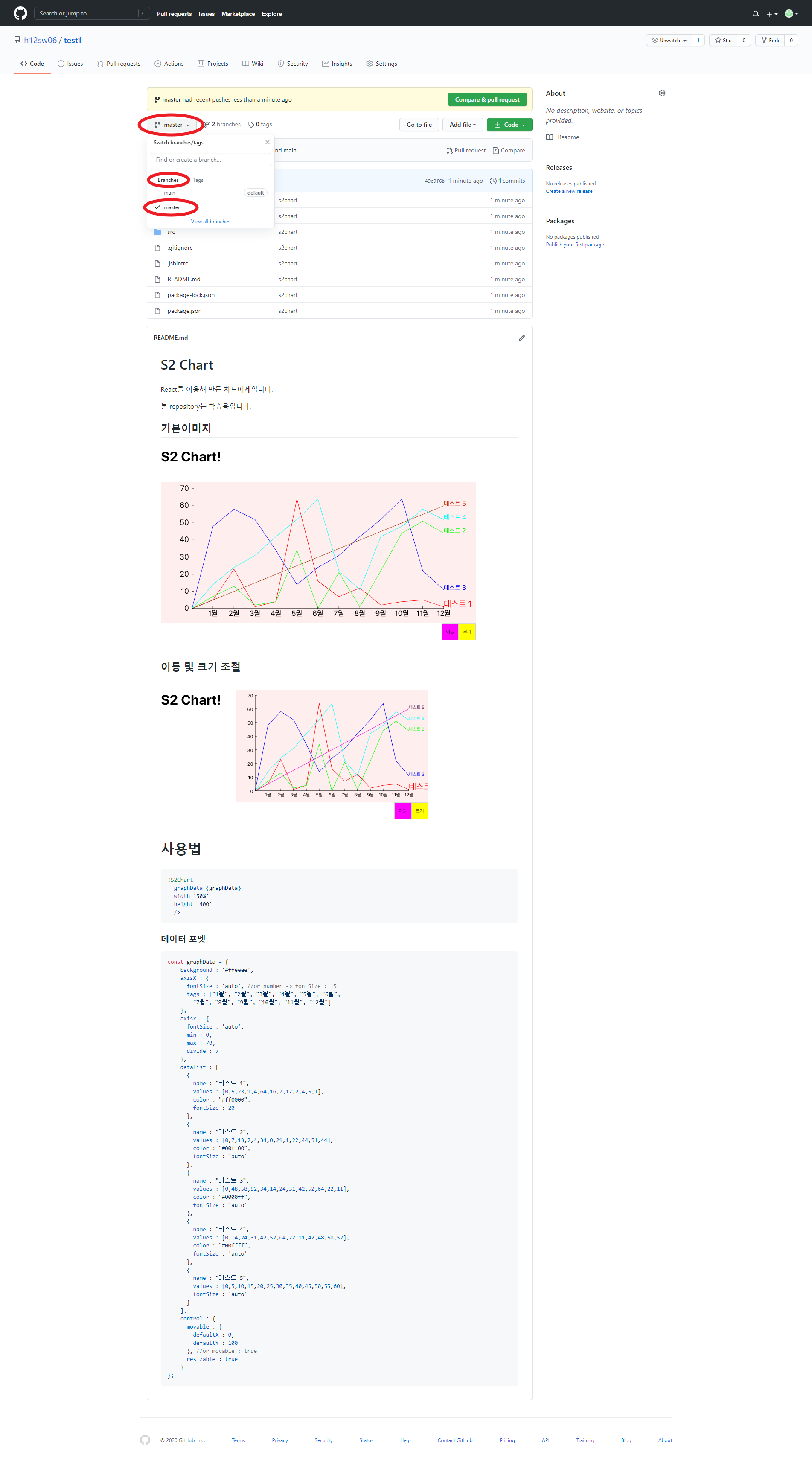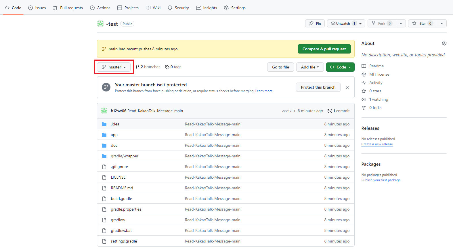 업로드한 Git페이지에 다시 들어가면 아까 선택한 브런치로 기본값으로 변경 된것을 확인 할수 있습니다.