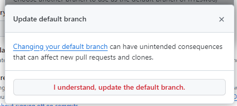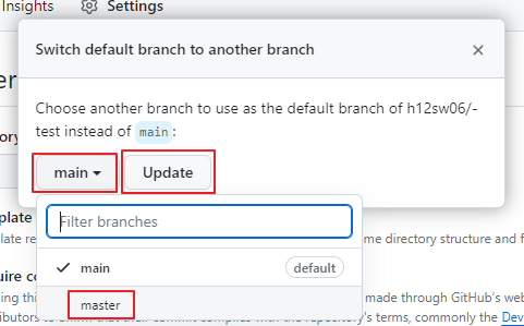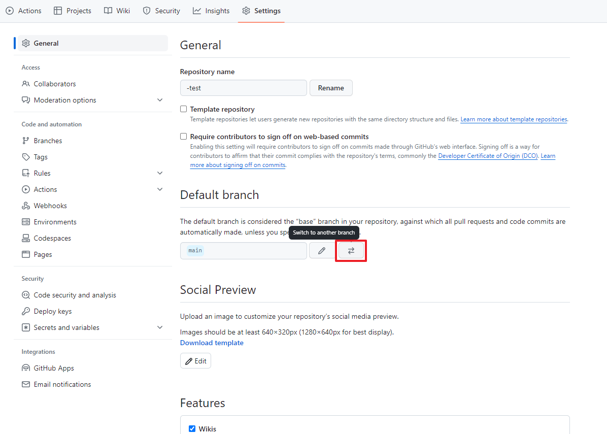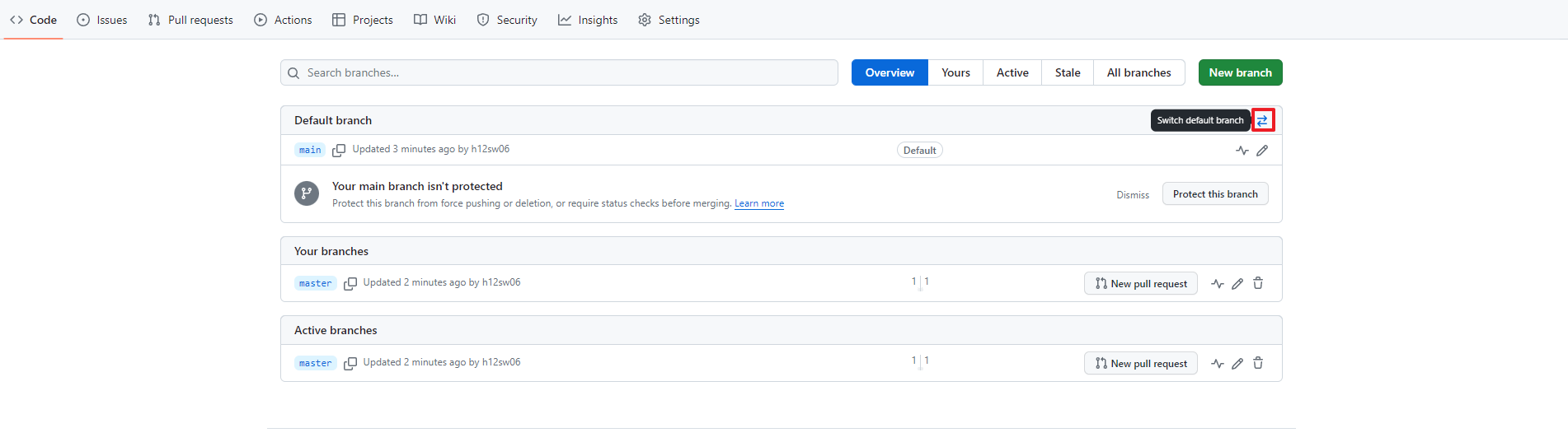 General -> Default branch -> "좌우 화살표 모양" 클릭합니다