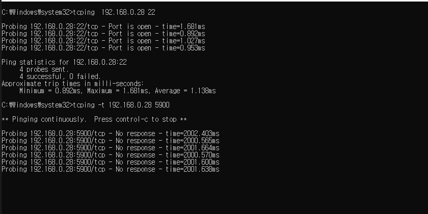 tcping으로 포트 살아있는지 테스트중...(tcping : https://all-share-source-code.tistory.com/8)