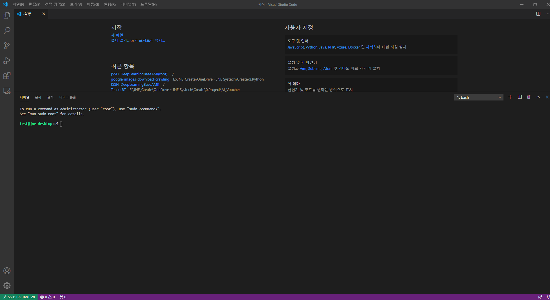지금은 SSH는 열려있어서 SSH로 VSCode에서 진행하도록 하겠습니다.