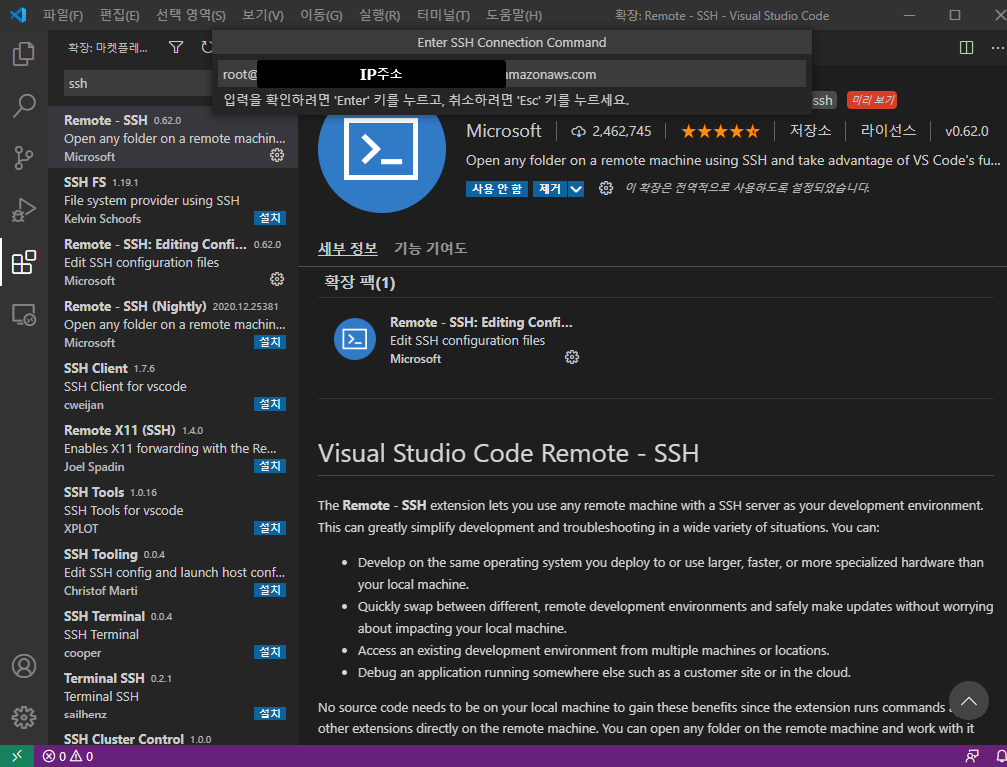 1. 참고로 VSCode Remote - SSH 같은 경우 버그인지 패스워드를 귀찮게 계속 물어보는데(root계정이 그런 거 같습니다..)