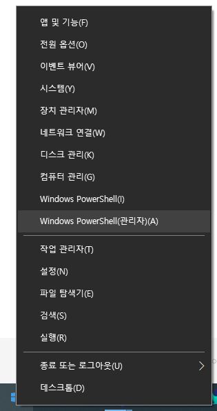 윈도우 우클릭 -> 관리자 권한 파워셀