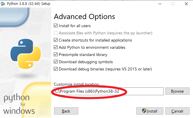 Install for all users 체크 후 위치 변경되는데 ctrl+c(복사) -> Install(설치) 클릭