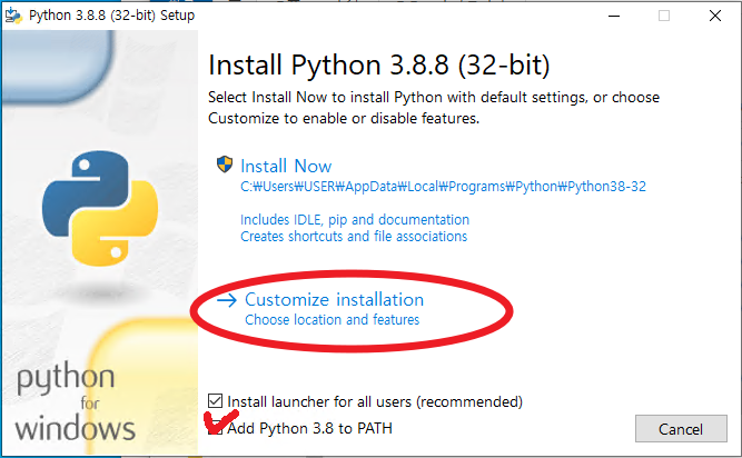 add Python 3.X(버전) to PATH (환경변수 자동 설정) 체크 -> 커스텀 클릭