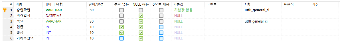 (SQL의 VARCHAR길이, INT길이, NULL허용, 부호 있음&없음, 기본값 등 잘 확인하셔야 합니다.)