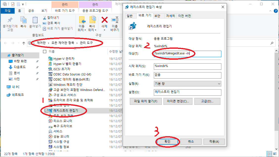 '관리도구'에서 '레지스트리 편집기' 우클릭 속성 들어가서