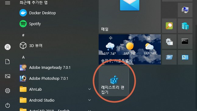 다시 '레지스트리 편집기' 우클릭에서 시작 화면에 고정