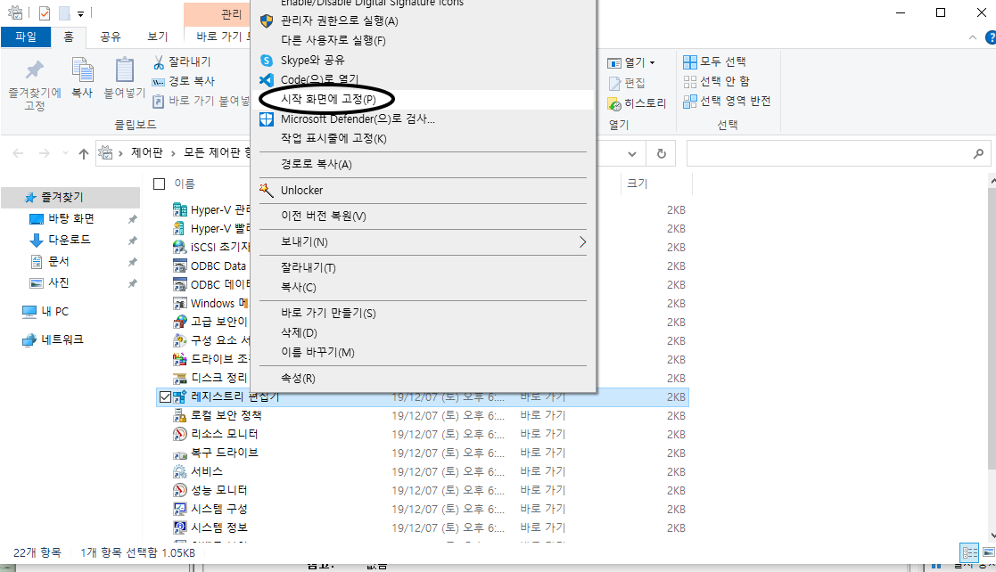다시 '레지스트리 편집기' 우클릭에서 시작 화면에 고정