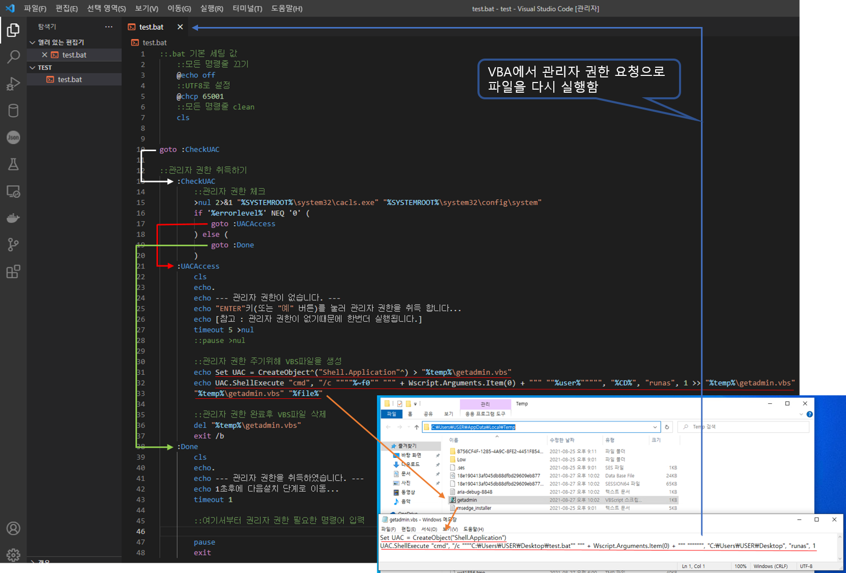 2-2-4. echo UAC.ShellExecute "cmd" , "/c """" %~f0 "" """ + Wscript.Arguments.Item(0) + """ "" %user% """"" , " %CD% " , "runas" , 1 >> " %temp% \getadmin.vbs"이내용을 기존 파일에 내용 추가합니다.('echo "내용" >> "c:\저장\위치.vbs"' 파일 내용 추가 즉 UNIX&Linux 의 'cat >'과 유사 또는 'echo'동일 )