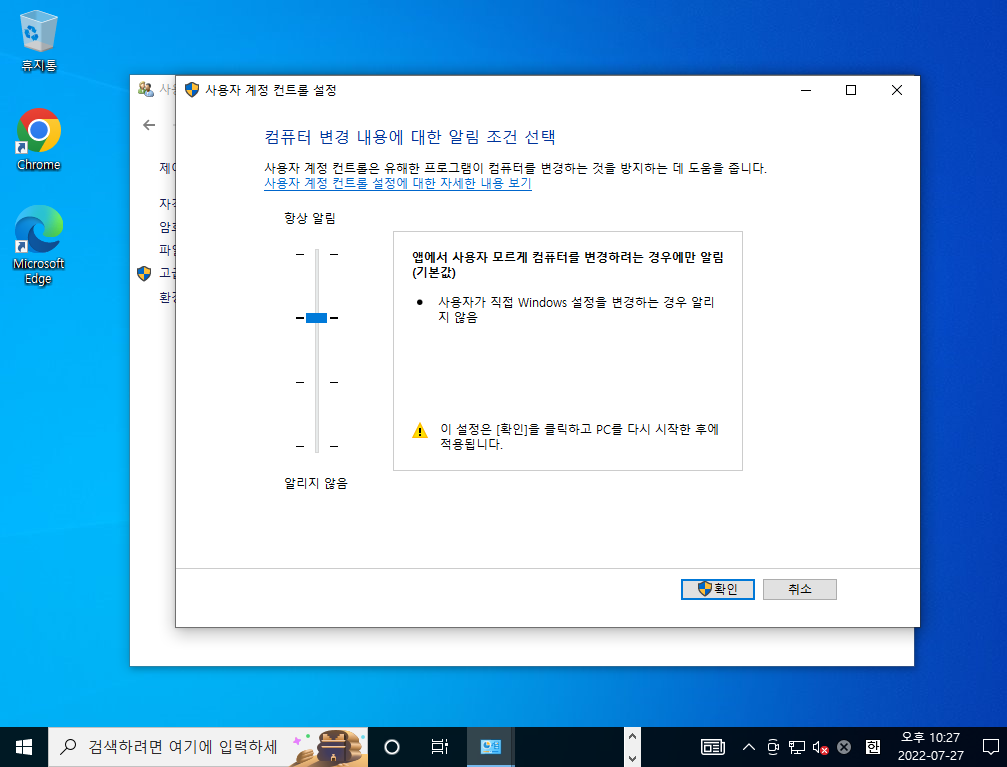 admin계정에서 사용자 계정 컨트롤 설정을 기본값으로 변경해 줍니다.