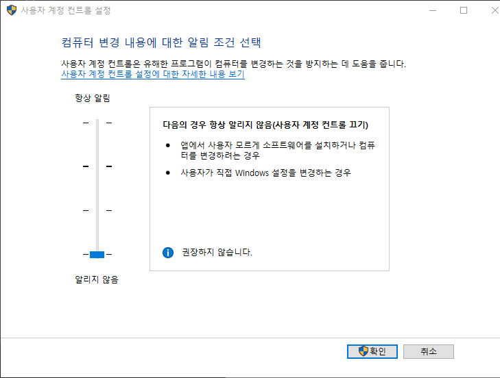 사용자 계정 컨트롤 최하로 설정할 경우