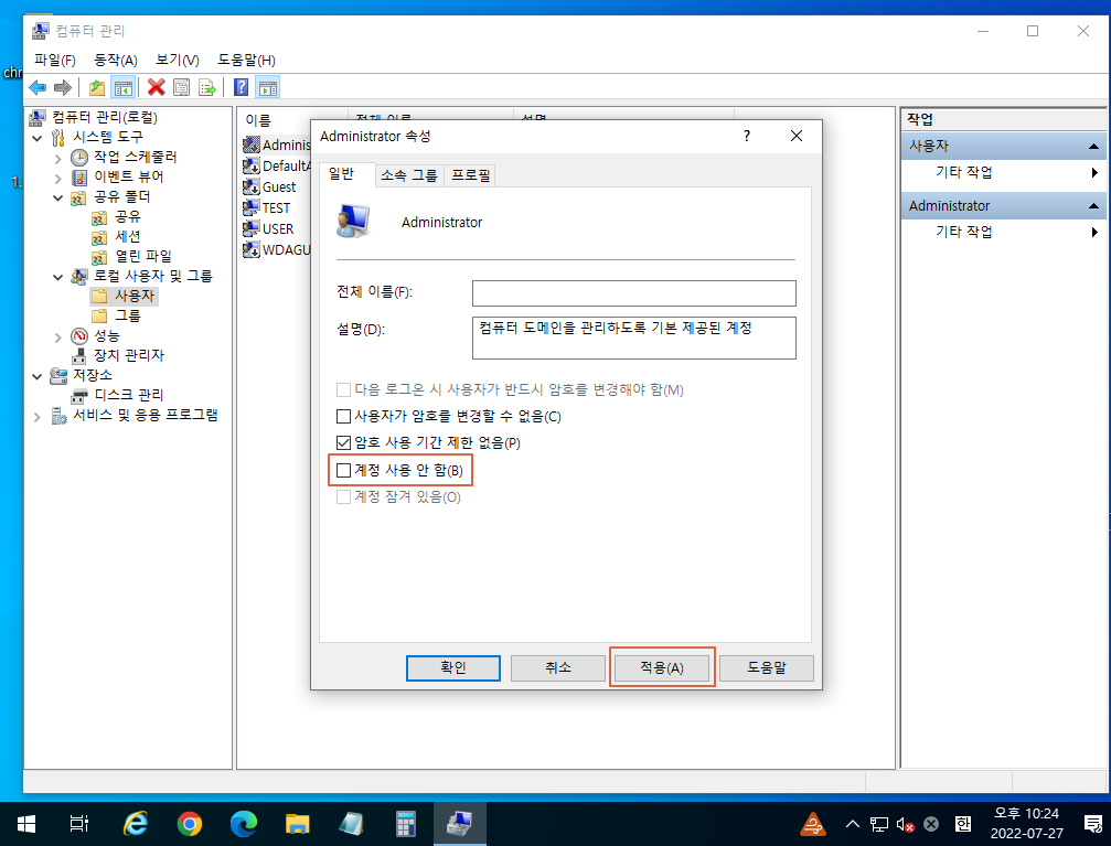 따라서 소속 그룹을 Users(사용자)보다는 Adminstrators(관리자)로 사용하시는 것을 추천드립니다.