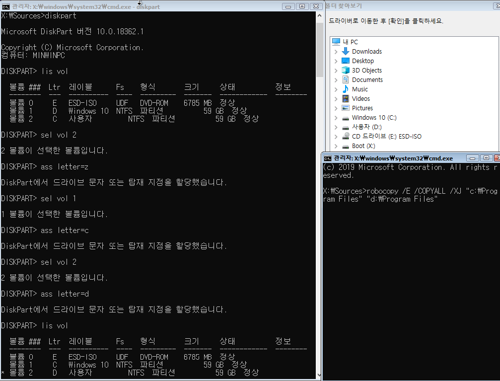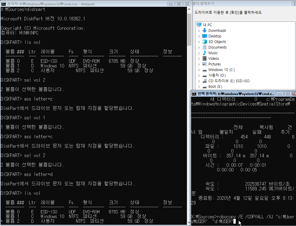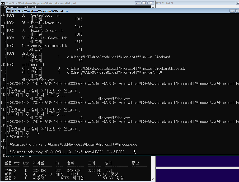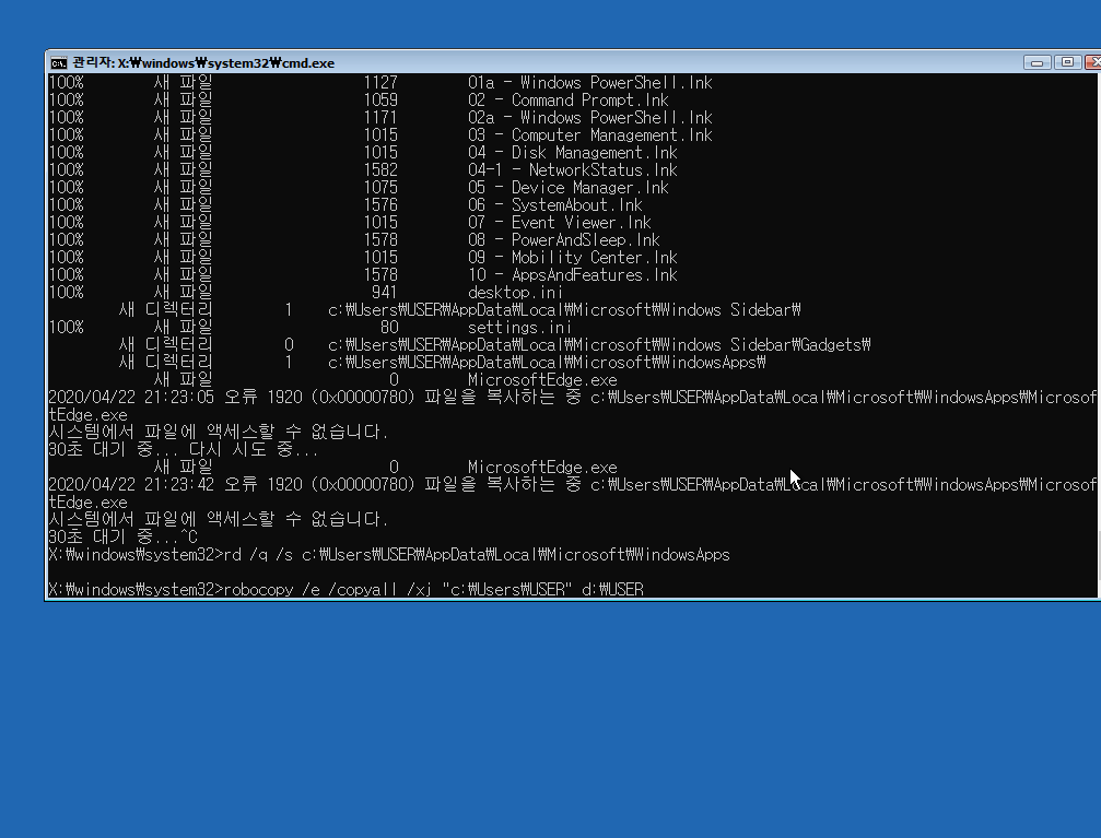 (사실 robocopy /E /COPYALL /XJ "C:\Users\(계정 이름)" "D:\Users\(계정 이름)" 이런 식으로 진행하셔도 되는데 굳이 폴더를 하나 더 만들 필요는 없을 거 같더라고요...)