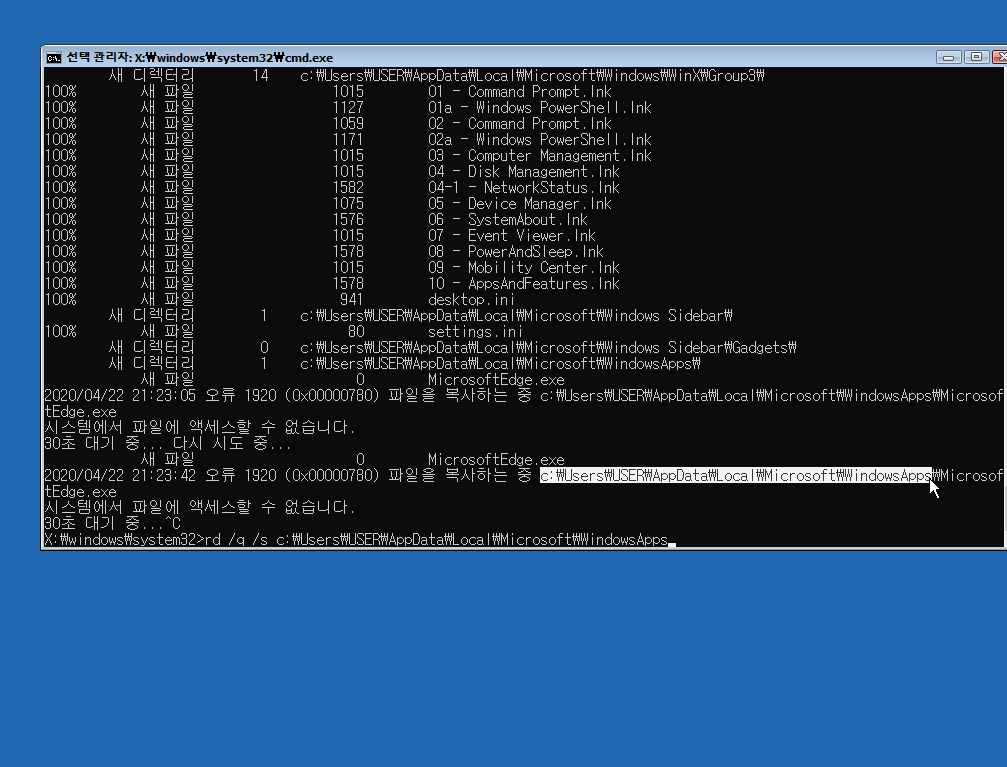 rd /q /s 붙여 넣기