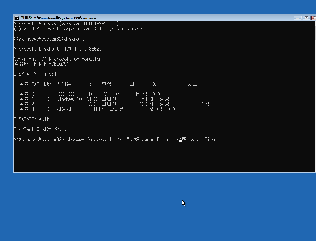 robocopy /E /COPYALL /XJ "C:\Users\(계정 이름)" "D:\(계정 이름)"