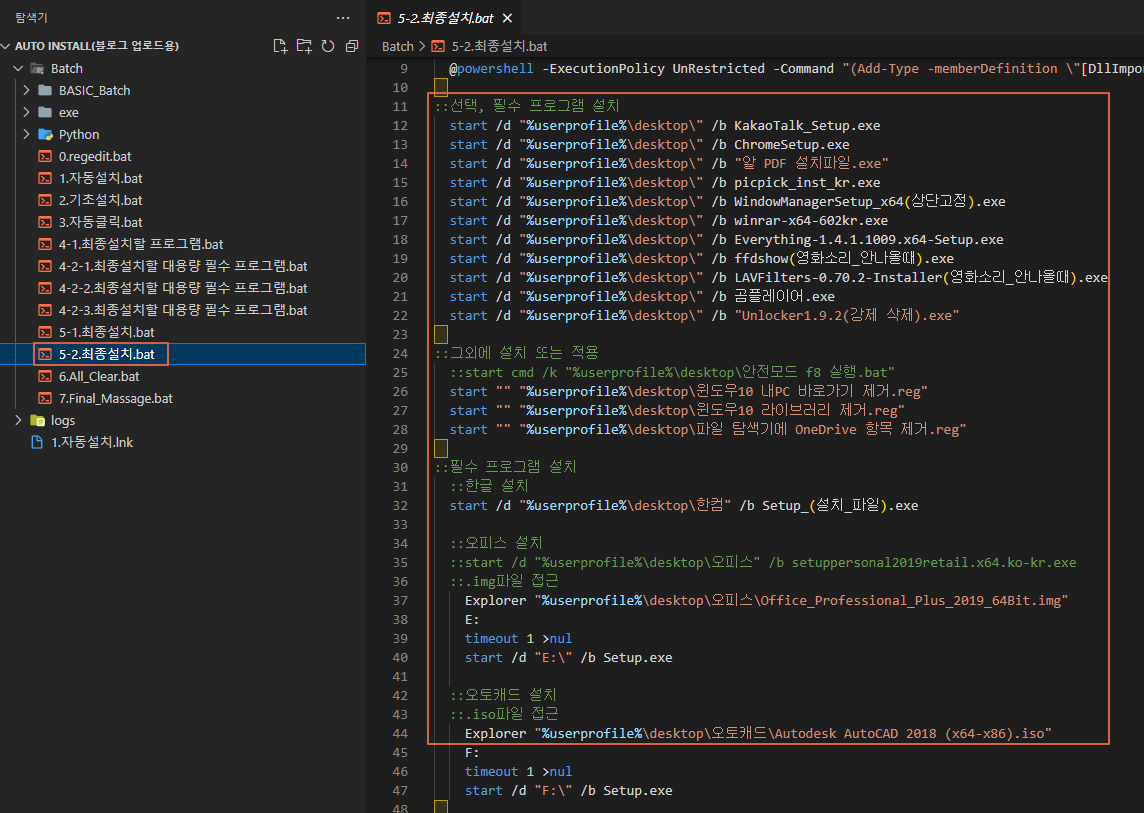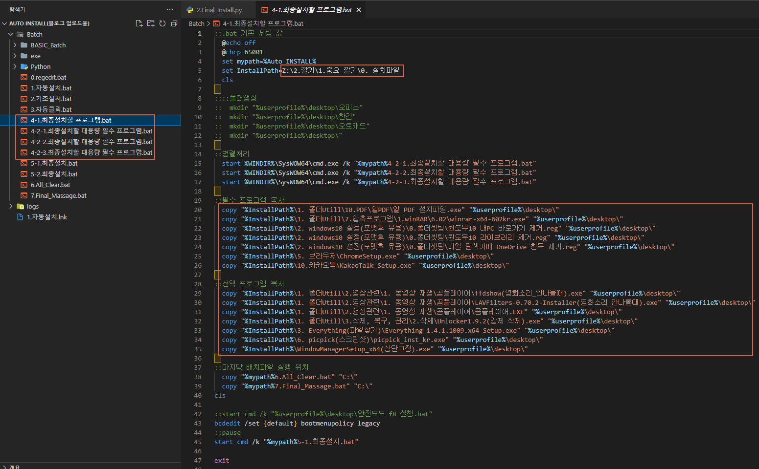 위 이미지는 '4-1. 최종설치할 프로그램. bat' 코드입니다. 빨간 박스 부분을 자신에 맞게 설정합니다.