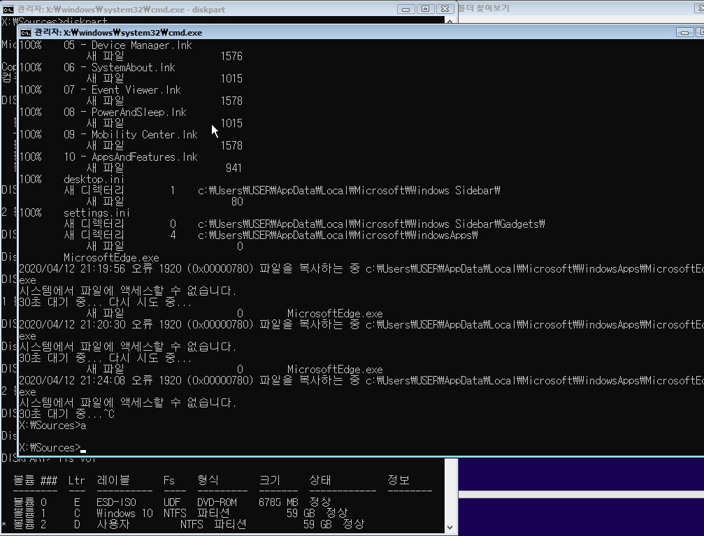 그리고 진행을 하다 보면 액세스 할 수 없다고 나오는 ctrl+z 해서 빠져나옵니다.