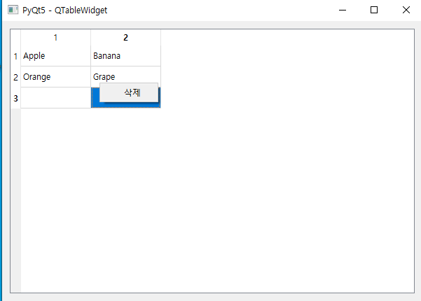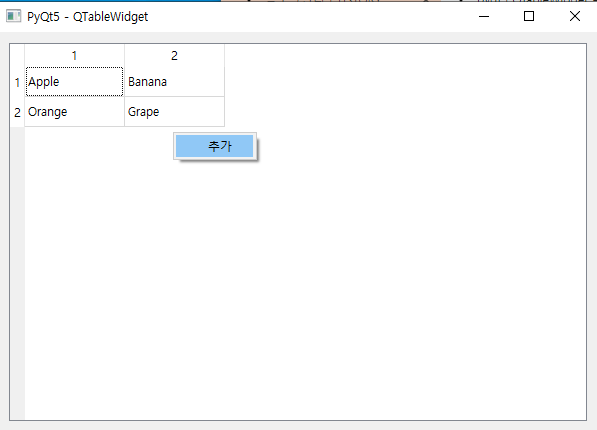 self.tableWidget.setItem(1, 1, QTableWidgetItem('Grape'))