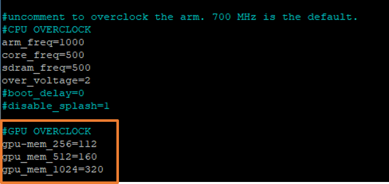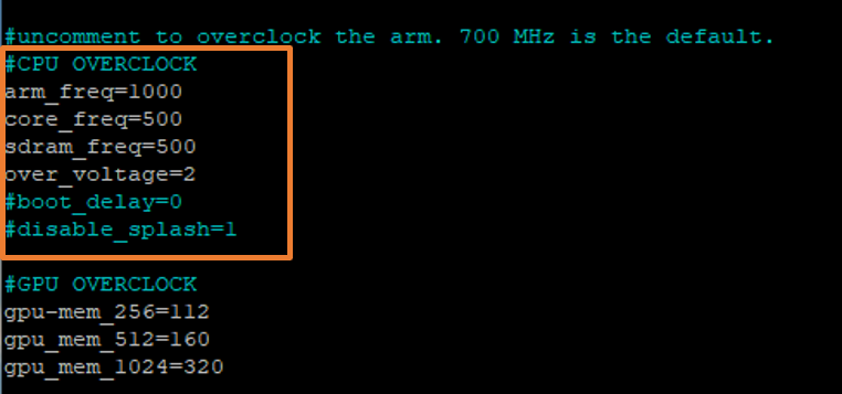 여기 아래 내리다 보면 'arm_freq='라고 있을 건데 이게 클럭 설정하는 값입니다.(참고 : '#'은 주석입니다.)
