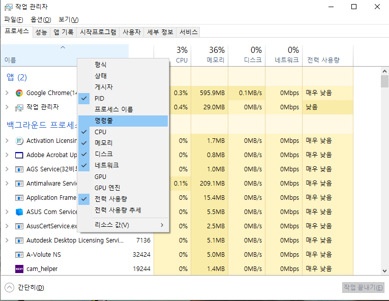 작업 관리자처럼 일단 Name 쪽 라인에 우클릭하면