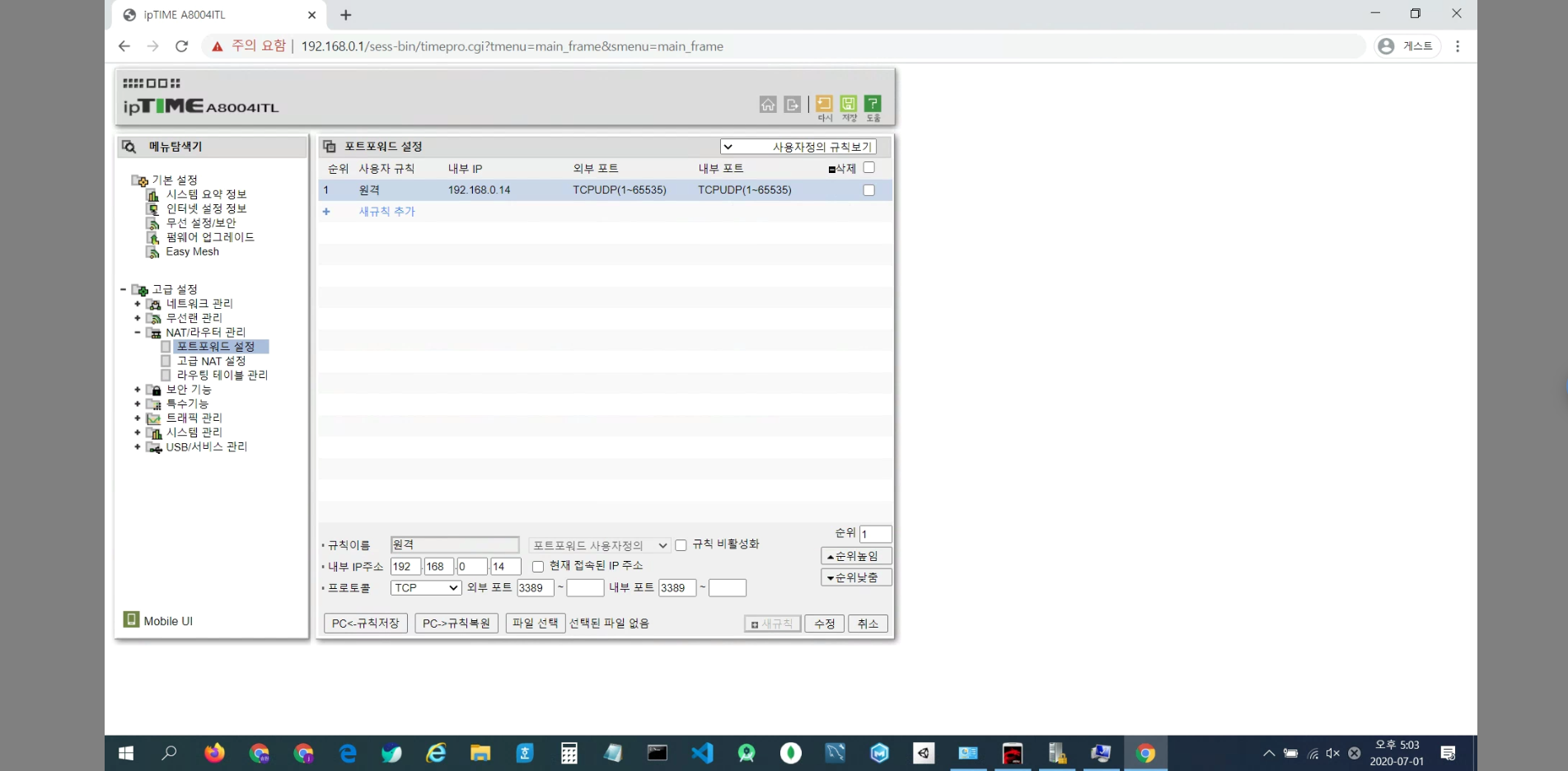 포트포워드 부분에서 저처럼 광범위하게 열면 충돌 나서 연결이 안 되더라고요