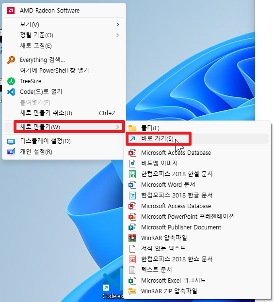 그리고 바탕화면에 '새로 만들기' -> '바로 가기' 합니다.(이미지 참조)