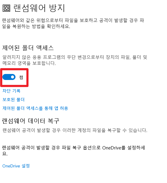 그리고 모든 작업을 다했으면 다시 램섬웨어 방지를 키는게 좋겠죠? ^^;;