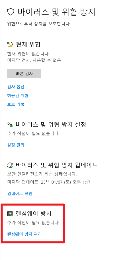 바이러스 및 위협 방지 -> 랜섬웨어 방지 관리 클릭 [아래 2개 이미지 참조]