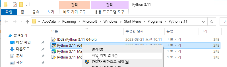 파일 위치가 나오면 해당 링크 파일을 다시 우클릭 하여 '파일 위치 열기'를 클릭 합니다.