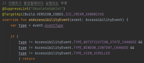 MyAccessibilityService 아래 코드를 보니 TYPE_WINDOW_CONTENT_CHANGED, TYPE_VIEW_SCROLLED도 사용 되는게 있어 추가 해주었습니다.