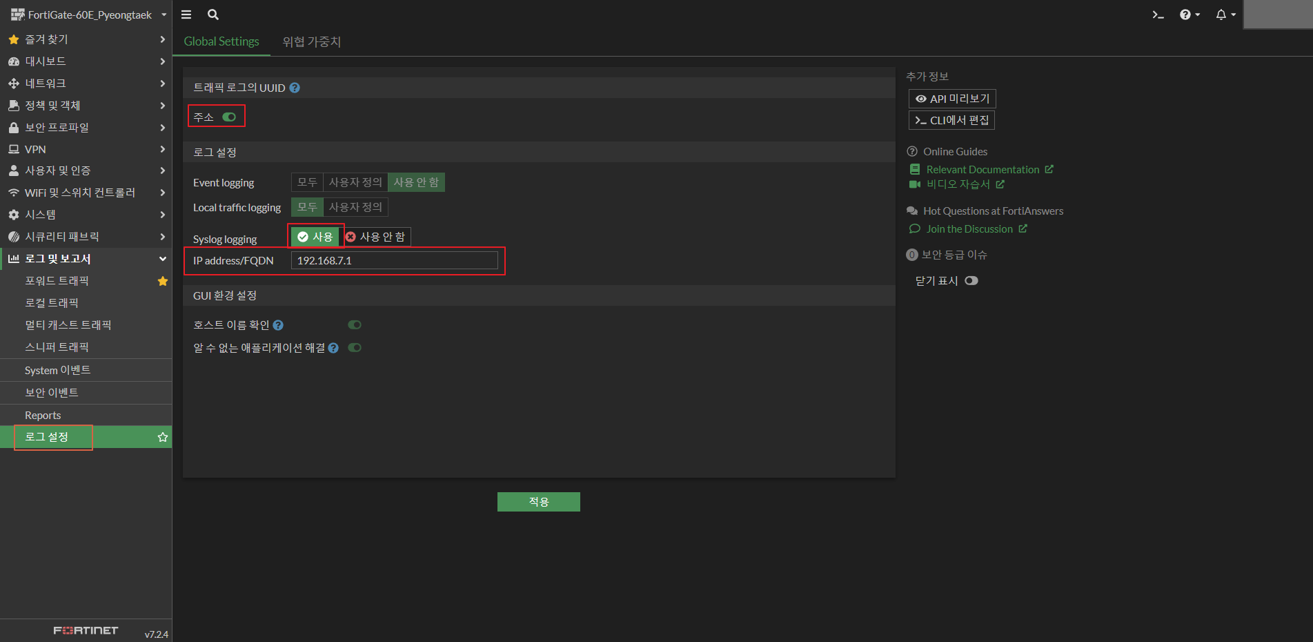 3. 로그 및 보고서 -> 로그 설정 -> Global Setting -> IP address/FQDN -> fortigate와 연결된 서버IP주소 입력 (Syslog logging 사용하면 입력 가능)
