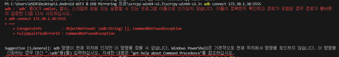 먼저 cmd키고 scrcpy폴더 안에 들어갑니다.