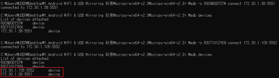 .\adb -s 자신의_디바이스2_ID connect 디바이스와_연결된_IP:5552
