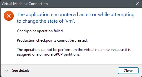 "하나 이상의 GPUP파티션이 할당되어 있어 가상 컴퓨터에서 작업을 수행할 수 없습니다" 오류가 나올시